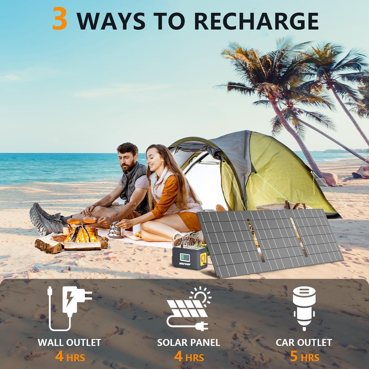 Efficient Output: This portable power station features 8 output ports, including 2 AC sockets (110V 120W, 240W peak), 1 USB-C port (18W), 2 QC 3.0 USB ports, 1 USB port (5V 2.4A), and 2 DC ports (12V/10A). The LED display clearly shows the working status and remaining power. Ideal for camping and outdoor adventures, this camping power bank can power devices like night lights , mini fans, and below 120W other essential equipment, making it a reliable companion for your trips Easy To Carry: This portable solar power bank (6.6 x 4 x 3 inches) is a must-have, weighing just 2.3 pounds for effortless portability. Its innovative hidden handle saves space while providing convenience, and it supports simultaneous charging-powering up the bank while charging your devices. Perfect for emergencies, it keeps your mobile phones, laptops, iPads, PSPs, cameras, and wireless headphones powered wherever you go. A reliable, space-saving solution for both home and on-the-go energy needs, m