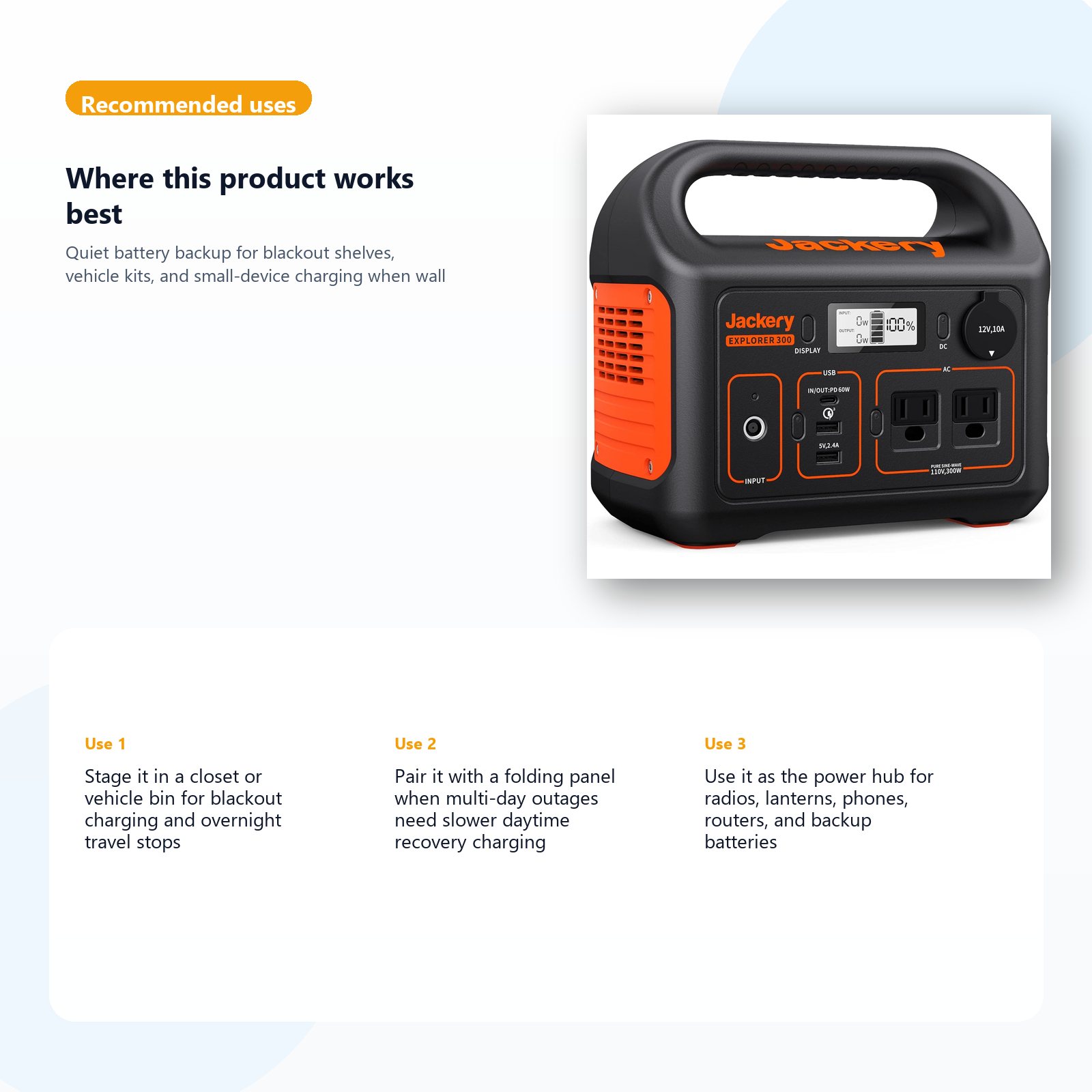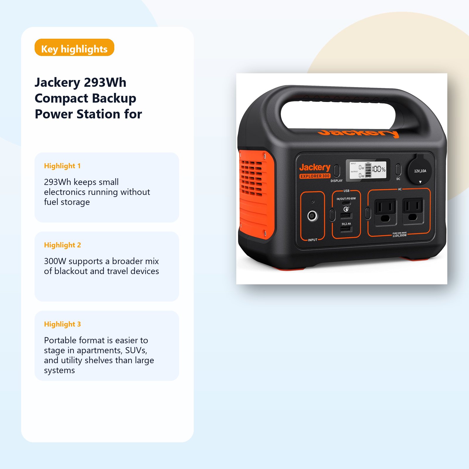 Jackery 293Wh Power Station for Blackout and Vehicle Backup supports blackout backup power, vehicle emergency charging, and off-grid weekend use when phones, radios, routers, lights, and other small electronics need a steadier power source.