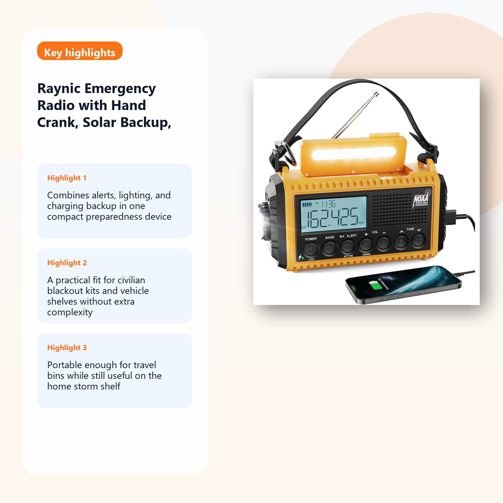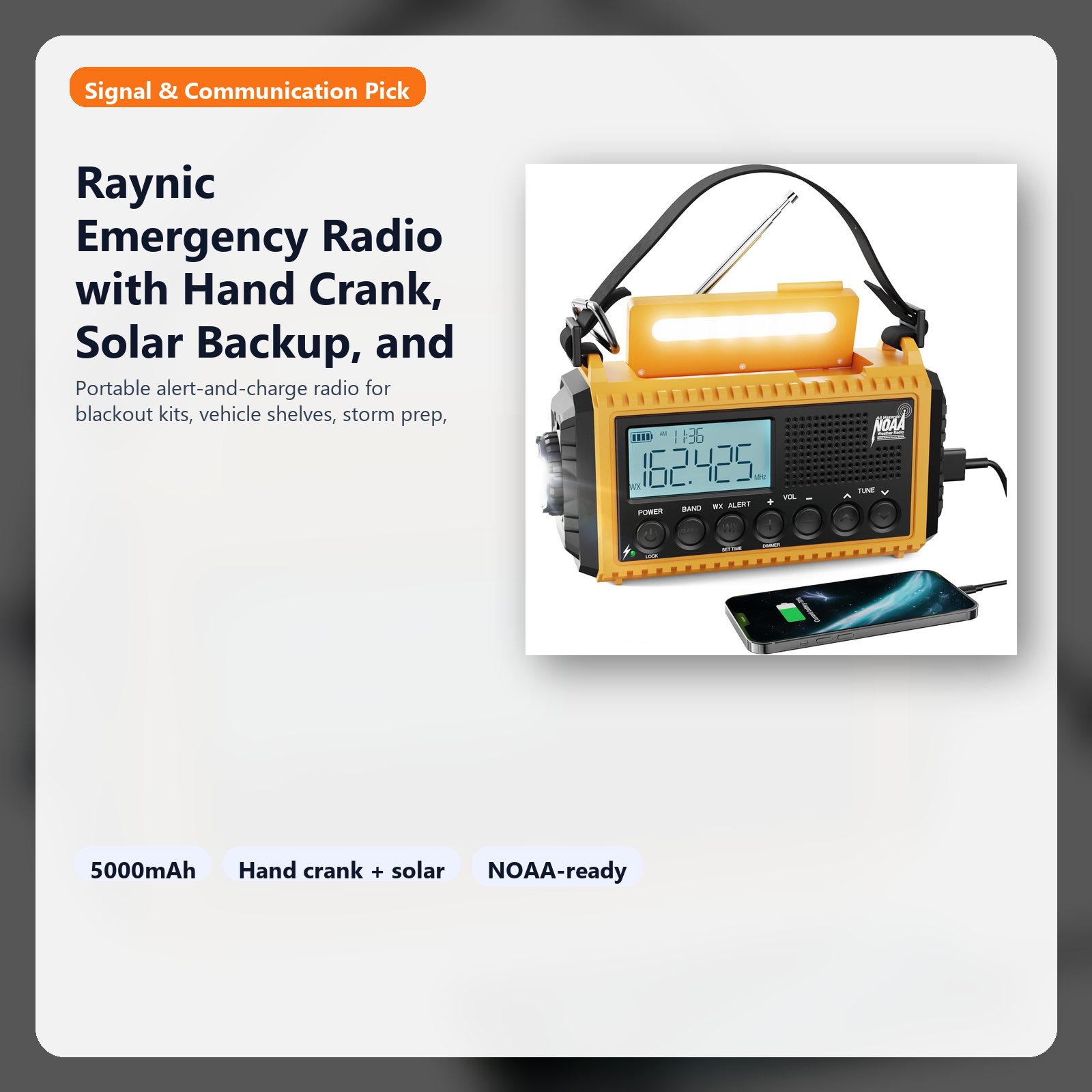 Raynic Emergency Radio with Hand Crank, Signal & Communication Pick — Portable alert-and-charge radio for blackout kits, vehicle shelves, storm prep, and compact travel communication. Emergency radio with hand-crank, solar, and small-device charging backup Built for blackouts, storm shelves, roadside kits, and travel continuity Combines alerts, flashlight support, and charging in one easy-grab unit