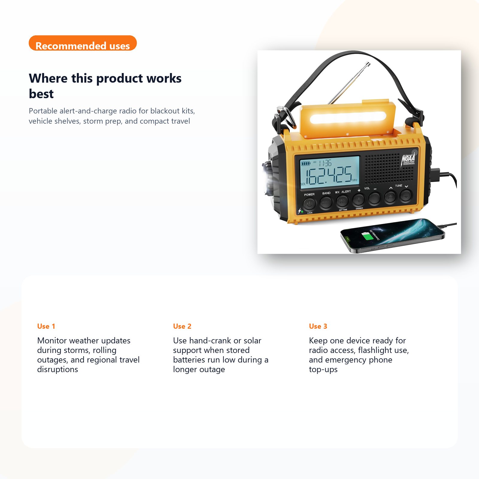 • Households that want an all-in-one alert, light, and charging layer on the storm shelf